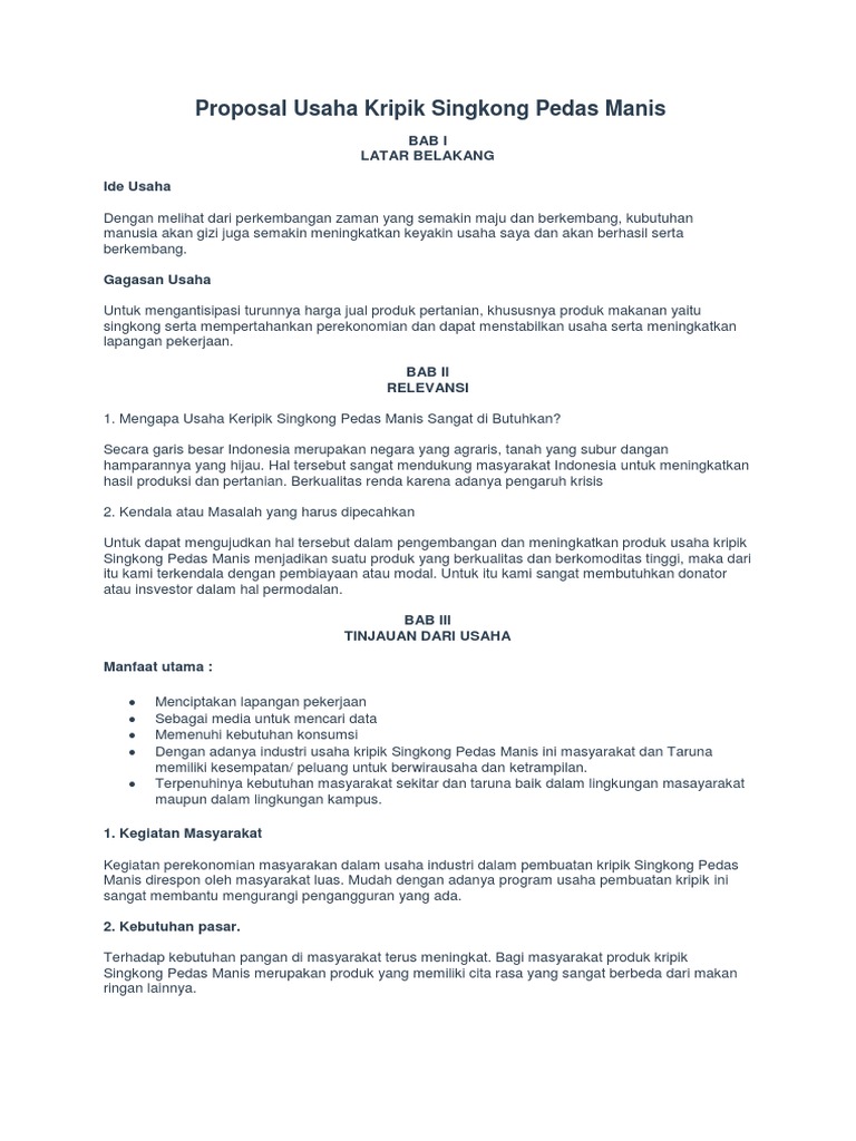Proposal usaha keripik singkong : Tujuan maksud penyusunan proposal usaha keripik singkong adalah. Contoh proposal rencana bisnis keripik pedas 123 pendahuluan. Contoh proposal keripik brainly co id. Makalah usaha keripik singkong :